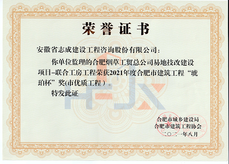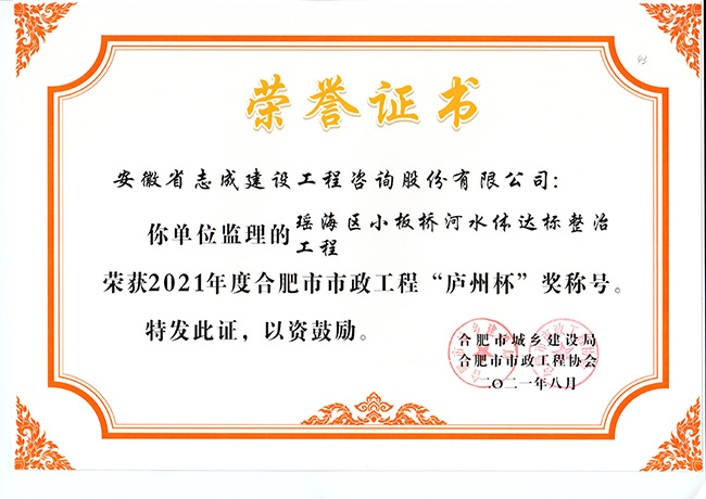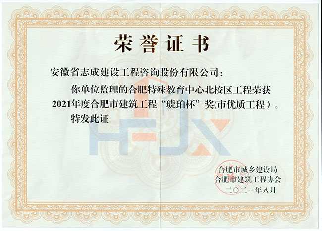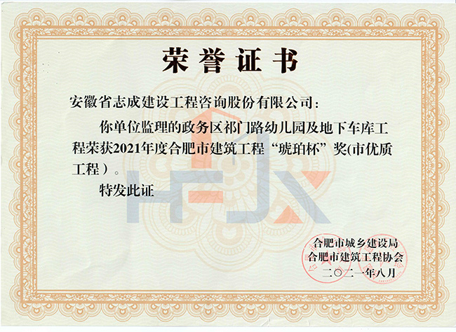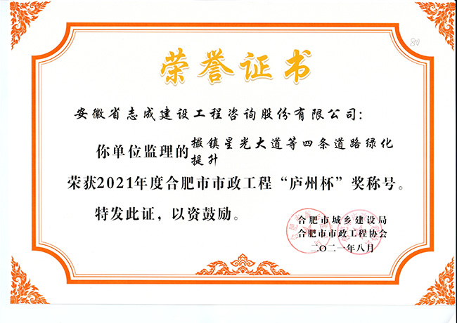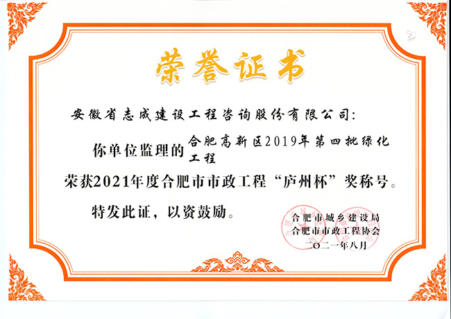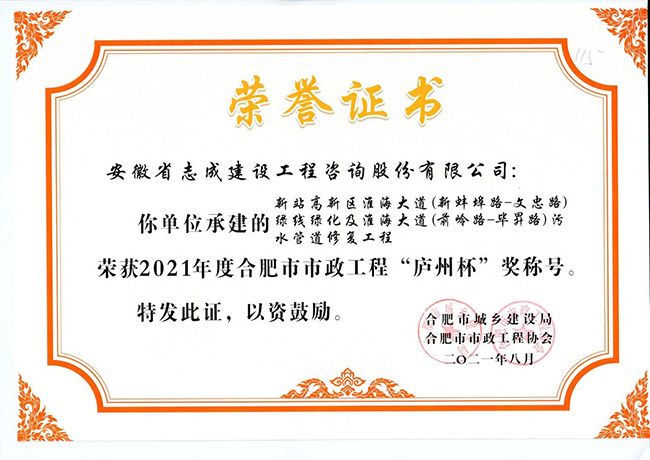 我公司合肥市特殊教育中心北校區(qū)工程、政務區(qū)祁門路幼兒園及地下車庫工程、合肥煙草工貿總公司易地技改建設項目-聯(lián)合工房工程喜獲2021年度合肥市建筑工程“琥珀杯”獎;.瑤海區(qū)小板橋河水體達標整治理工程、合肥高新區(qū)2019年度第四批綠化工程、分水嶺路(新港路-團肥路)工程、新站高新區(qū)淮海大道(新蚌埠路-文忠路)綠線綠化及淮海大道(前嶺路-畢昇路)污水管道修復工程、撮鎮(zhèn)星光大道等四條道路綠化提升工程、安徽居巢經濟開發(fā)區(qū)投資有限公司S105與S208連接線工程殷家山路、朝陽山路、平頂山工程、肥東縣縣級道路暢通工程(馬湖至石塘)道路綠化工程喜獲2021年度合肥市市政工程“廬州杯”獎。